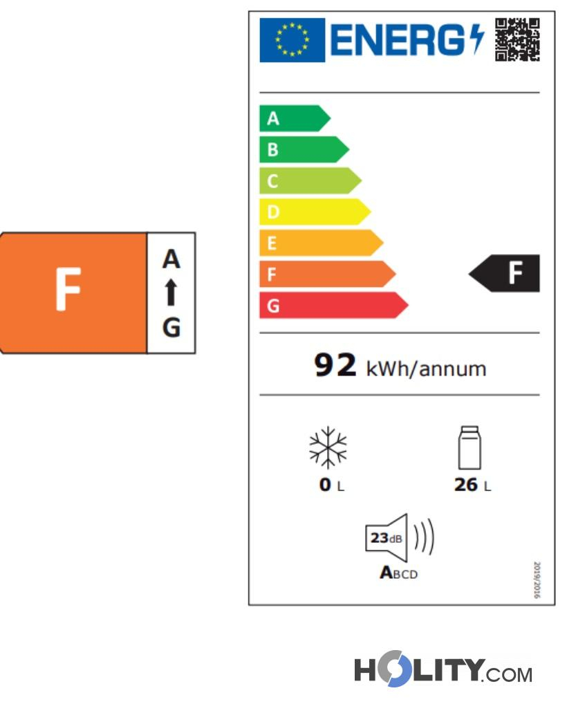 30 lt eco-friendly minibar, silent class F thermoelectric system. Black structure 54x41.9x39.7 cm with 2 adjustable shelves and LED light.