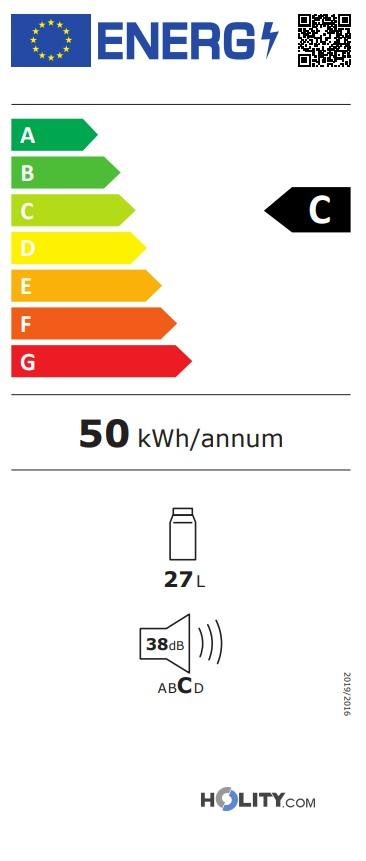 27 lt compressor minibar in class C. Exclusive design with reversible and panel-ready door. Reduced consumption (0.137 kWh/24h) and maximum silence (38 dB).