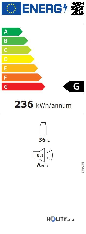 Thermoelectric minibar with 36 net liters capacity and reversible glass door. Completely silent and fanless, with aluminum shelves and LED light. Dimensions: W 39.9 x D 48 x H 55.3 cm.