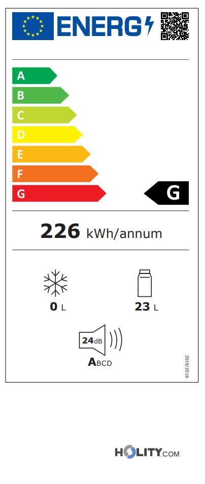 The H76_89 hotel room minibar is a compact 23-liter solution designed to ensure guests a comfortable stay, allowing for the storage of drinks and snacks at an optimal temperature. Thanks to the cyclic defrost system and the electronic thermostat, the device prevents the formation of ice and water residues, operating with a noise emission class A so as not to disturb night rest. The versatile structure allows for both freestanding and built-in installation, adapting to various types of contract and professional furniture.