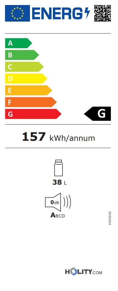 38-liter net thermoelectric minibar, ultra-silent and designed for built-in installation. Reversible panelable door, LED light, and aluminum shelves. Dimensions: W 49 x D 48.5 x H 57 cm.