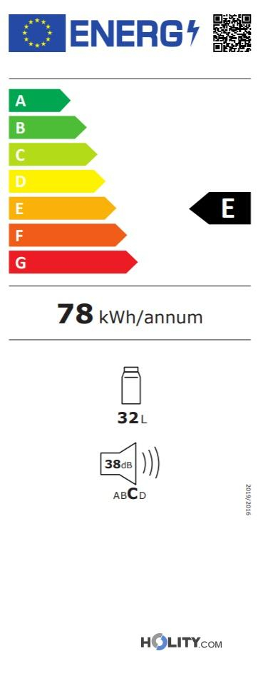Compressor minibar with 32 lt net capacity and reversible glass door. Innovative design, ultra-silent (38 dB) and energy class E. Dimensions: W 400 x D 480 x H 555 mm.